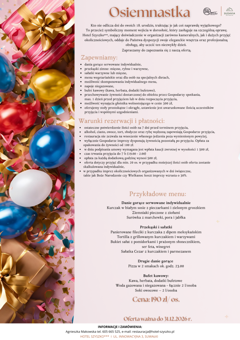Któż nie czekałby na swoje 18-te urodziny, jak na wyjątkowe święto? Przecież jest to symboliczny początek dorosłości, a więc na pewno okazja dla wyjątkowej oprawy. Hotel Szyszko***, specjalizujący się w dużych i małych przyjęciach okolicznościowych, proponuje Państwu swoje wnętrze i usługi do organizacji tego wyjątkowego dnia.