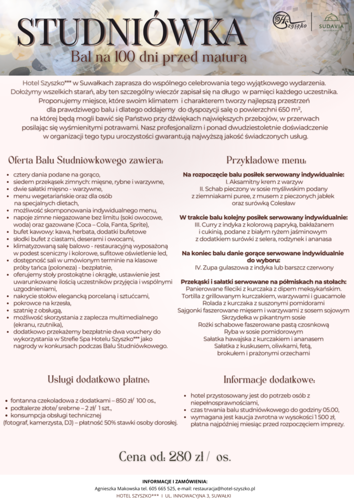 Hotel Szyszko*** w Suwałkach zaprasza do wspólnego celebrowania tego wyjątkowego wydarzenia. Dołożymy wszelkich starań, aby ten szczególny wieczór zapisał się na długo w pamięci każdego uczestnika. Proponujemy miejsce, które swoim klimatem i charakterem tworzy najlepszą przestrzeń dla prawdziwego balu i dlatego oddajemy do dyspozycji salę o powierzchni 650 m², na której będą mogli bawić się Państwo przy dźwiękach największych przebojów, w przerwach posilając się wyśmienitymi potrawami. Nasz profesjonalizm i ponad dwudziestoletnie doświadczenie w organizacji tego typu uroczystości gwarantują najwyższą jakość świadczonych usług.